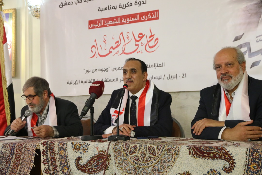 نظمت السفارة اليمنية بالتعاون مع المستشارية الثقافية الإيرانية في دمشق ندوة فكرية بمناسبة الذكري السنوية الرابعة لاستشهاد الرئيس صالح الصماد، بالتزامن مع اختتام معرض وجوه من نور.